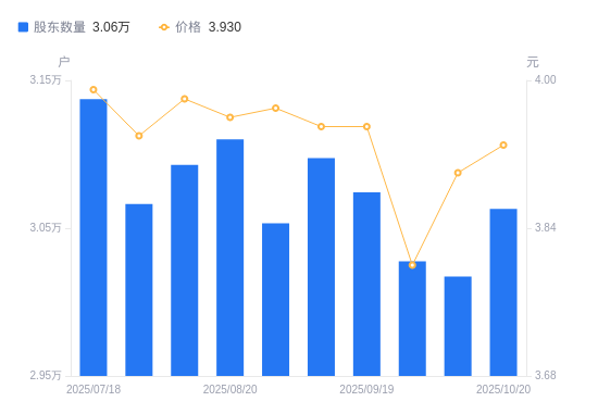 近一年(2024年10月31日至2025年10月20日),亚厦股份A股股东户数从3.12万户,减低至3.06万户,降幅1.98%,区间股价上涨2.02%。