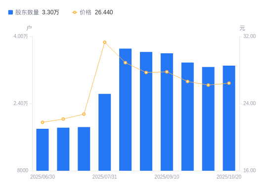 近一年(2024年10月31日至2025年10月20日),奇正藏药A股股东户数从1.99万户,增加至3.3万户,增幅66.24%,区间股价上涨20.50%。