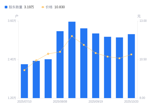 近一年(2024年10月31日至2025年10月20日),新天药业A股股东户数从2.52万户,增加至3.19万户,增幅26.39%,区间股价下跌8.64%。