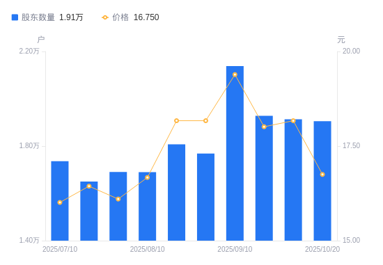 近一年(2024年10月31日至2025年10月20日),英力股份A股股东户数从2.59万户,减低至1.91万户,降幅26.58%,区间股价上涨1.36%。