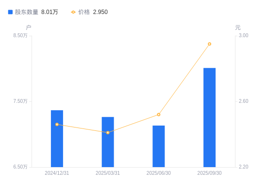 10月27日消息,数据显示,截至2025年9月30日,怡球资源A股股东总户数为8.01万户,较上期(2025年6月30日)增加8753户,增幅12.27%。公司最新A股总股本为22.01亿股,其中流通A股22.01亿股,户均持有流通A股数量为2.75万股,较上期减少3372.85股,降幅10.93%;户均持流通A股市值8.11万元,较上期增加3319.58元,增幅4.27%。
