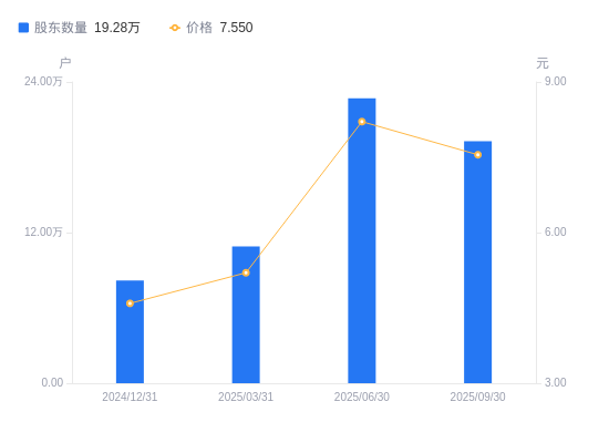 10月27日消息,数据显示,截至2025年9月30日,融发核电A股股东总户数为19.28万户,较上期(2025年6月30日)减少3.43万户,降幅15.10%。公司最新A股总股本为20.81亿股,其中流通A股12.56亿股,户均持有流通A股数量为6517.51股,较上期增加984.25股,增幅17.79%;户均持流通A股市值4.92万元,较上期增加3779.13元,增幅8.32%。