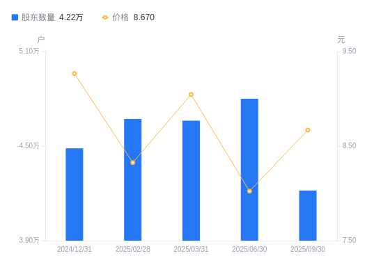 近一年(2024年9月30日至2025年9月30日),益生股份A股股东户数从5万户,减低至4.22万户,降幅15.70%,区间股价上涨2.77%。