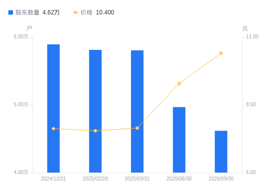 近一年(2024年9月30日至2025年9月30日),云图控股A股股东户数从5.97万户,减低至4.62万户,降幅22.67%,区间股价上涨36.66%。