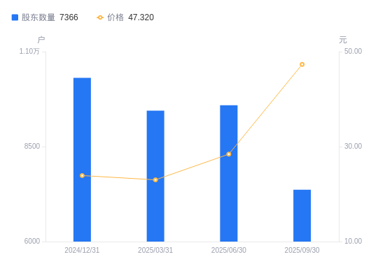 10月27日消息,数据显示,截至2025年9月30日,和顺科技A股股东总户数为7366户,较上期(2025年6月30日)减少2225户,降幅23.20%。公司最新A股总股本为8000万股,其中流通A股6586.25万股,户均持有流通A股数量为8941.42股,较上期增加4849.04股,增幅118.49%;户均持流通A股市值42.31万元,较上期增加30.68万元,增幅263.92%。