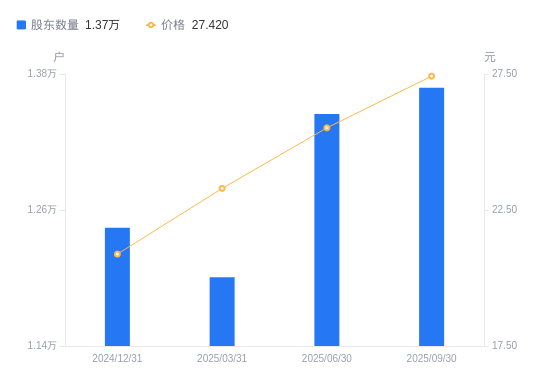 近一年(2024年9月30日至2025年9月30日),迈赫股份A股股东户数从1.23万户,增加至1.37万户,增幅10.85%,区间股价上涨62.80%。