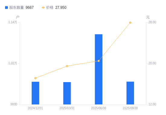近一年(2024年9月30日至2025年9月30日),联德股份A股股东户数从9239户,增加至9667户,增幅4.63%,区间股价上涨110.75%。