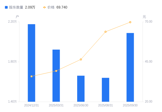 近一年(2024年9月30日至2025年9月30日),金诚信A股股东户数从2.36万户,减低至2.09万户,降幅11.68%,区间股价上涨43.97%。