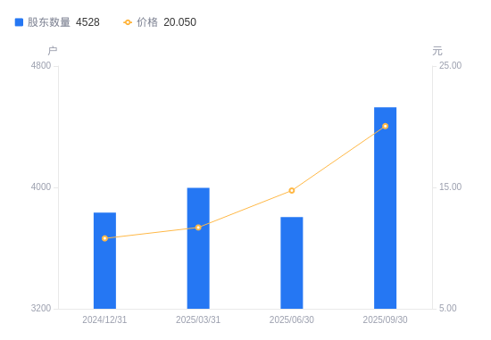 近一年(2024年9月30日至2025年9月30日),迈得医疗A股股东户数从4462户,增加至4528户,增幅1.48%,区间股价上涨79.34%。
