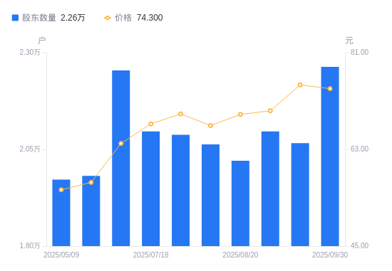 10月27日消息,数据显示,截至2025年9月30日,义翘神州A股股东总户数为2.26万户,较上期(2025年9月10日)增加1970户,增幅9.53%。公司最新A股总股本为1.22亿股,其中流通A股1.2亿股,户均持有流通A股数量为5283.93股,较上期减少503.82股,降幅8.70%;户均持流通A股市值39.26万元,较上期减少4.15万元,降幅9.56%。