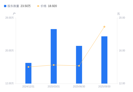 近一年(2024年9月30日至2025年9月30日),中天科技A股股东户数从18.79万户,增加至23.5万户,增幅25.10%,区间股价上涨35.32%。