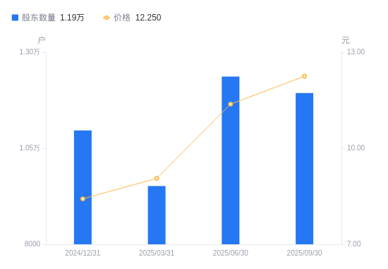 近一年(2024年9月30日至2025年9月30日),宁波富邦A股股东户数从1.17万户,增加至1.19万户,增幅2.28%,区间股价上涨54.48%。