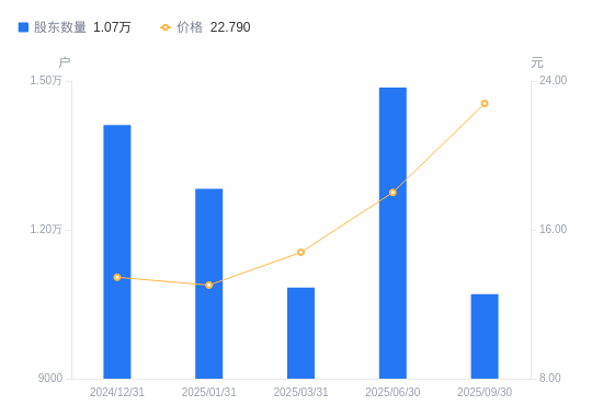 10月27日消息,数据显示,截至2025年9月30日,日播时尚A股股东总户数为1.07万户,较上期(2025年6月30日)减少4163户,降幅28.00%。公司最新A股总股本为2.37亿股,其中流通A股2.37亿股,户均持有流通A股数量为2.21万股,较上期增加6197.61股,增幅38.88%;户均持流通A股市值50.45万元,较上期增加21.74万元,增幅75.75%。