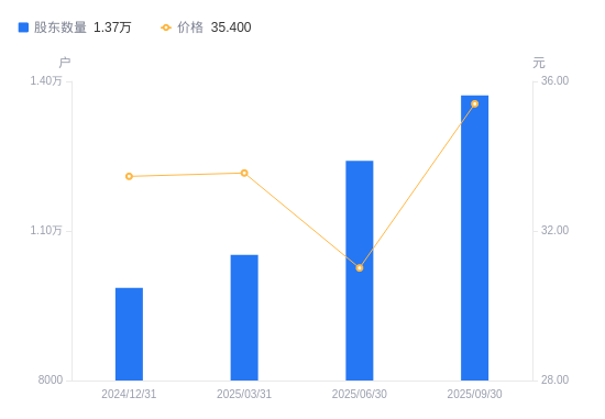 10月27日消息,数据显示,截至2025年9月30日,唯捷创芯A股股东总户数为1.37万户,较上期(2025年6月30日)增加1311户,增幅10.57%。公司最新A股总股本为4.3亿股,其中流通A股1.69亿股,户均持有流通A股数量为1.23万股,较上期减少615.3股,降幅4.75%;户均持流通A股市值43.67万元,较上期增加3.51万元,增幅8.73%。