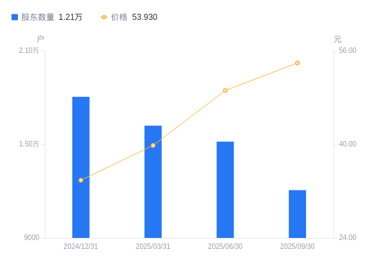10月27日消息,数据显示,截至2025年9月30日,众辰科技A股股东总户数为1.21万户,较上期(2025年6月30日)减少3105户,降幅20.46%。公司最新A股总股本为1.49亿股,其中流通A股4153.6万股,户均持有流通A股数量为3440.97股,较上期增加677.23股,增幅24.50%;户均持流通A股市值18.56万元,较上期增加4.95万元,增幅36.42%。