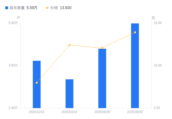 近一年(2024年9月30日至2025年9月30日),凌云股份A股股东户数从3.65万户,增加至5.59万户,增幅53.14%,区间股价上涨119.63%。