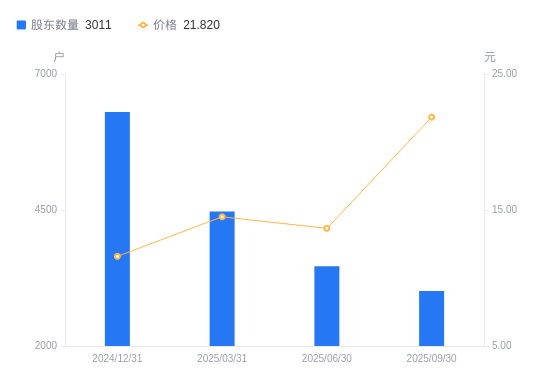 近一年(2024年9月30日至2025年9月30日),*ST原尚A股股东户数从6362户,减低至3011户,降幅52.67%,区间股价上涨117.76%。