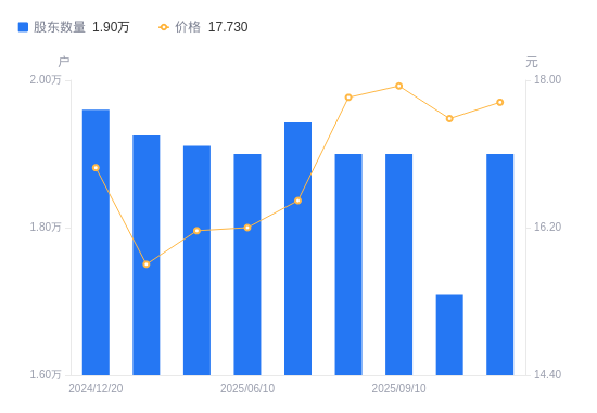 近一年(2024年9月30日至2025年9月30日),中荣股份A股股东户数从2.13万户,减低至1.71万户,降幅19.83%,区间股价上涨16.85%。