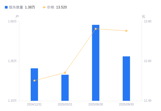 近一年(2024年9月30日至2025年9月30日),海程邦达A股股东户数从1.37万户,增加至1.38万户,增幅0.47%,区间股价上涨8.14%。