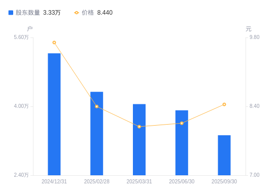 近一年(2024年9月30日至2025年9月30日),上海九百A股股东户数从5.23万户,减低至3.33万户,降幅36.38%,区间股价上涨3.58%。
