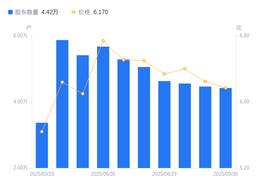 近一年(2024年9月30日至2025年9月30日),太阳电缆A股股东户数从3.56万户,增加至4.42万户,增幅24.18%,区间股价上涨23.40%。