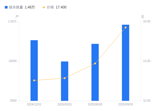 近一年(2024年9月30日至2025年9月30日),泰坦股份A股股东户数从1.34万户,增加至1.46万户,增幅8.92%,区间股价上涨111.78%。
