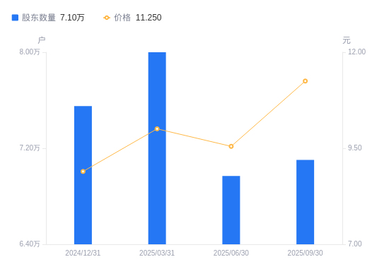 近一年(2024年9月30日至2025年9月30日),亚威股份A股股东户数从7.45万户,减低至7.1万户,降幅4.69%,区间股价上涨46.56%。