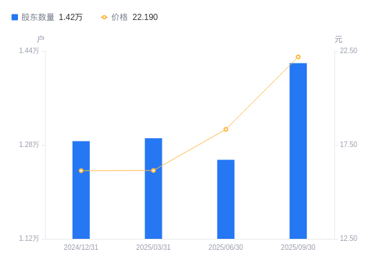 近一年(2024年9月30日至2025年9月30日),共同药业A股股东户数从1.42万户,减低至1.42万户,降幅0.06%,区间股价上涨39.56%。