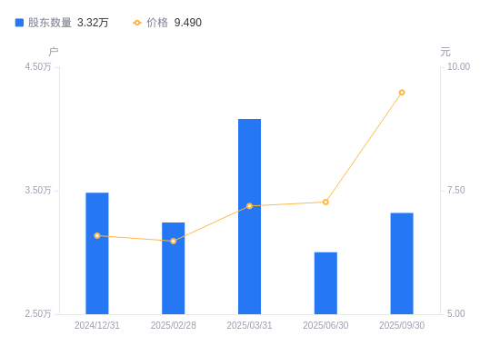 近一年(2024年9月30日至2025年9月30日),百花医药A股股东户数从4.05万户,减低至3.32万户,降幅18.08%,区间股价上涨31.08%。