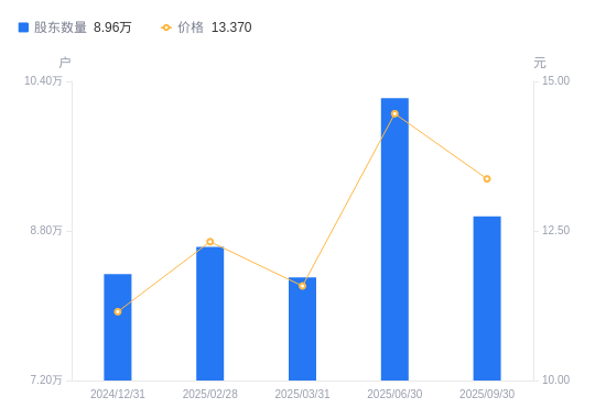 近一年(2024年9月30日至2025年9月30日),武汉凡谷A股股东户数从7.53万户,增加至8.96万户,增幅18.88%,区间股价上涨43.76%。
