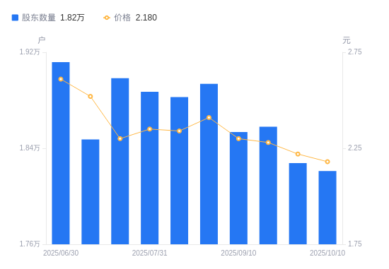 近一年(2024年9月30日至2025年9月30日),ST长方A股股东户数从2.21万户,减低至1.83万户,降幅17.36%,区间股价上涨70.77%。