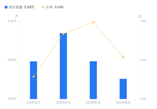 近一年(2024年9月30日至2025年9月30日),龙洲股份A股股东户数从5.81万户,减低至5.04万户,降幅13.31%,区间股价上涨13.01%。