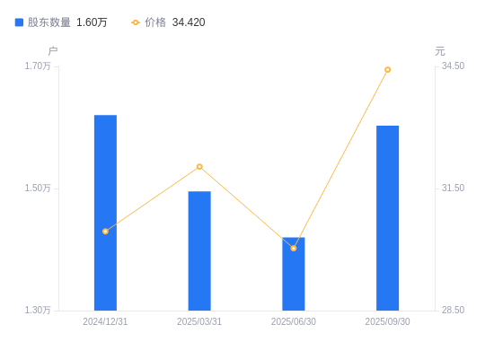 近一年(2024年9月30日至2025年9月30日),直真科技A股股东户数从1.57万户,增加至1.6万户,增幅2.09%,区间股价上涨32.10%。