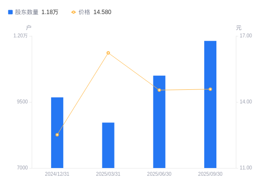 近一年(2024年9月30日至2025年9月30日),浙江力诺A股股东户数从1.04万户,增加至1.18万户,增幅13.11%,区间股价上涨36.39%。