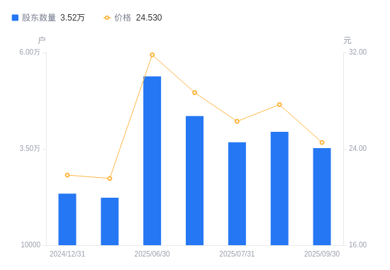 近一年(2024年9月30日至2025年9月30日),吉大正元A股股东户数从2.24万户,增加至3.52万户,增幅57.21%,区间股价上涨26.64%。