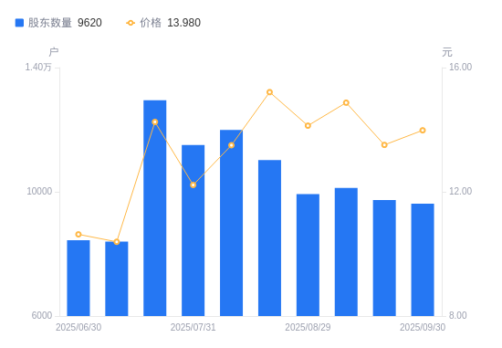 近一年(2024年9月30日至2025年9月30日),博汇股份A股股东户数从1.03万户,减低至9620户,降幅6.57%,区间股价上涨116.74%。