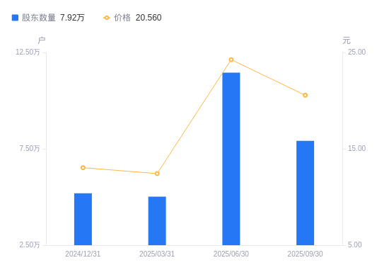 10月27日消息,数据显示,截至2025年9月30日,楚天龙A股股东总户数为7.92万户,较上期(2025年6月30日)减少3.54万户,降幅30.90%。公司最新A股总股本为4.61亿股,其中流通A股4.57亿股,户均持有流通A股数量为5770.93股,较上期增加1783.34股,增幅44.72%;户均持流通A股市值11.87万元,较上期增加2.2万元,增幅22.70%。