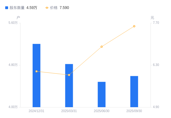 近一年(2024年9月30日至2025年9月30日),星湖科技A股股东户数从5.93万户,减低至4.59万户,降幅22.57%,区间股价上涨42.40%。