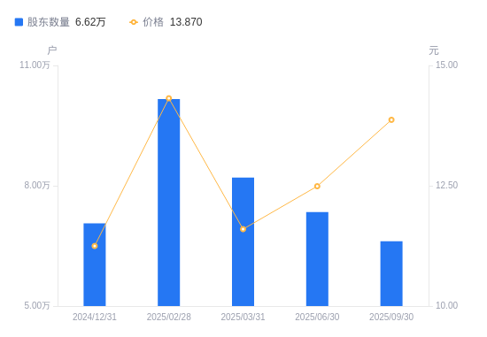 10月27日消息,数据显示,截至2025年9月30日,粤桂股份A股股东总户数为6.62万户,较上期(2025年6月30日)减少7239户,降幅9.86%。公司最新A股总股本为8.02亿股,其中流通A股4.54亿股,户均持有流通A股数量为6856.51股,较上期增加676.12股,增幅10.94%;户均持流通A股市值9.51万元,较上期增加1.79万元,增幅23.20%。