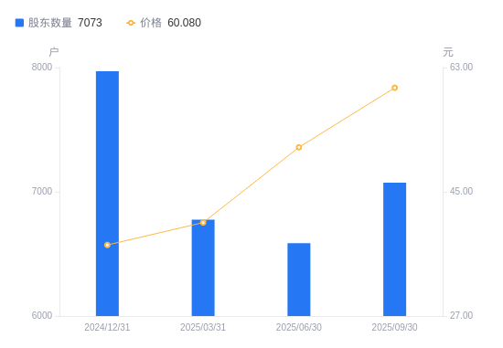 10月27日消息,数据显示,截至2025年9月30日,国能日新A股股东总户数为7073户,较上期(2025年6月30日)增加487户,增幅7.39%。公司最新A股总股本为1.33亿股,其中流通A股8522.55万股,户均持有流通A股数量为1.2万股,较上期减少890.99股,降幅6.89%;户均持流通A股市值72.39万元,较上期增加5.81万元,增幅8.73%。