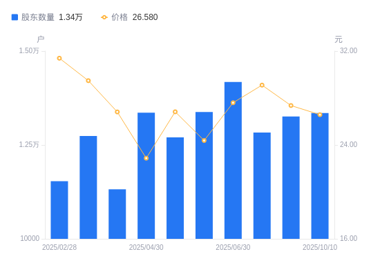 近一年(2024年9月30日至2025年9月30日),欧圣电气A股股东户数从1.01万户,增加至1.33万户,增幅31.62%,区间股价上涨87.64%。