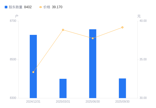 近一年(2024年9月30日至2025年9月30日),智迪科技A股股东户数从1.07万户,减低至8402户,降幅21.60%,区间股价上涨40.39%。