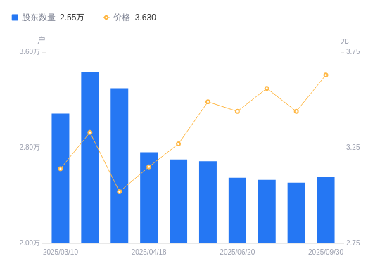 近一年(2024年9月30日至2025年9月30日),*ST中基A股股东户数从3.77万户,减低至2.55万户,降幅32.15%,区间股价上涨33.46%。