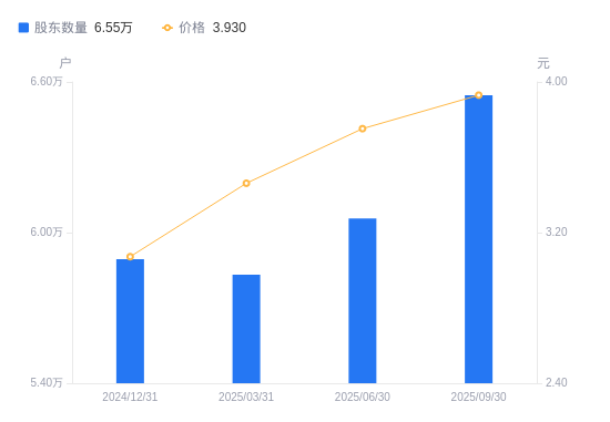 近一年(2024年9月30日至2025年9月30日),尚荣医疗A股股东户数从6.3万户,增加至6.55万户,增幅3.96%,区间股价上涨39.26%。