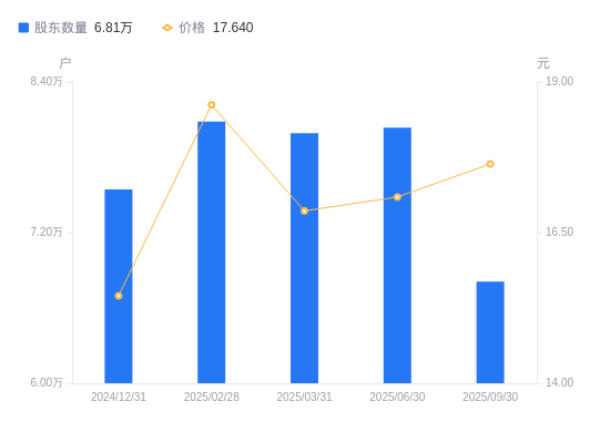 近一年(2024年9月30日至2025年9月30日),康强电子A股股东户数从6.25万户,增加至6.81万户,增幅8.95%,区间股价上涨54.47%。