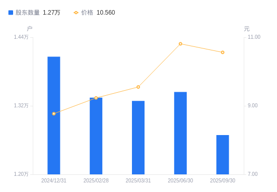 近一年(2024年9月30日至2025年9月30日),林海股份A股股东户数从1.49万户,减低至1.27万户,降幅14.62%,区间股价上涨30.53%。