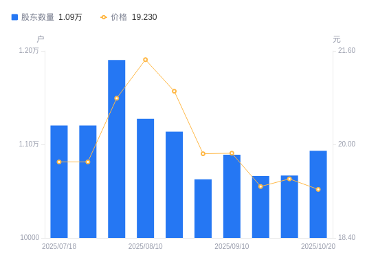 近一年(2024年11月29日至2025年10月20日),东亚药业A股股东户数从1.13万户,减低至1.09万户,降幅3.09%,区间股价上涨0.21%。