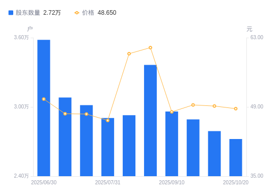 近一年(2024年11月8日至2025年10月20日),中天火箭A股股东户数从2.31万户,增加至2.72万户,增幅17.73%,区间股价上涨10.84%。