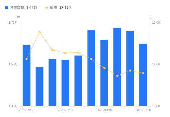 近一年(2024年11月29日至2025年10月20日),武汉天源A股股东户数从1.54万户,增加至1.62万户,增幅5.42%,区间股价下跌10.04%。