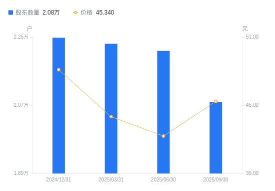 10月27日消息,数据显示,截至2025年9月30日,特发服务A股股东总户数为2.08万户,较上期(2025年6月30日)减少1352户,降幅6.11%。公司最新A股总股本为1.69亿股,其中流通A股1.69亿股,户均持有流通A股数量为8130.86股,较上期增加496.59股,增幅6.50%;户均持流通A股市值36.87万元,较上期增加4.58万元,增幅14.19%。